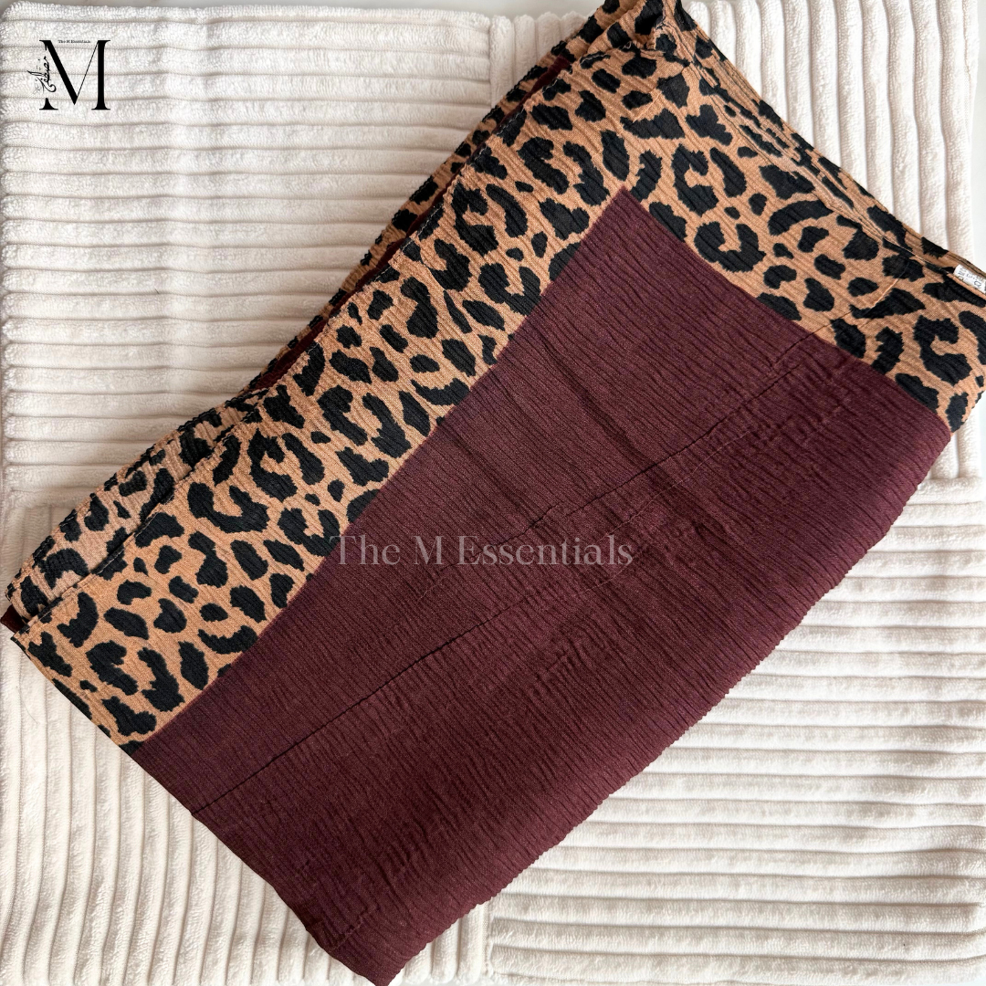 Digital animal print crinkle chiffon hijab in color Burgundy.