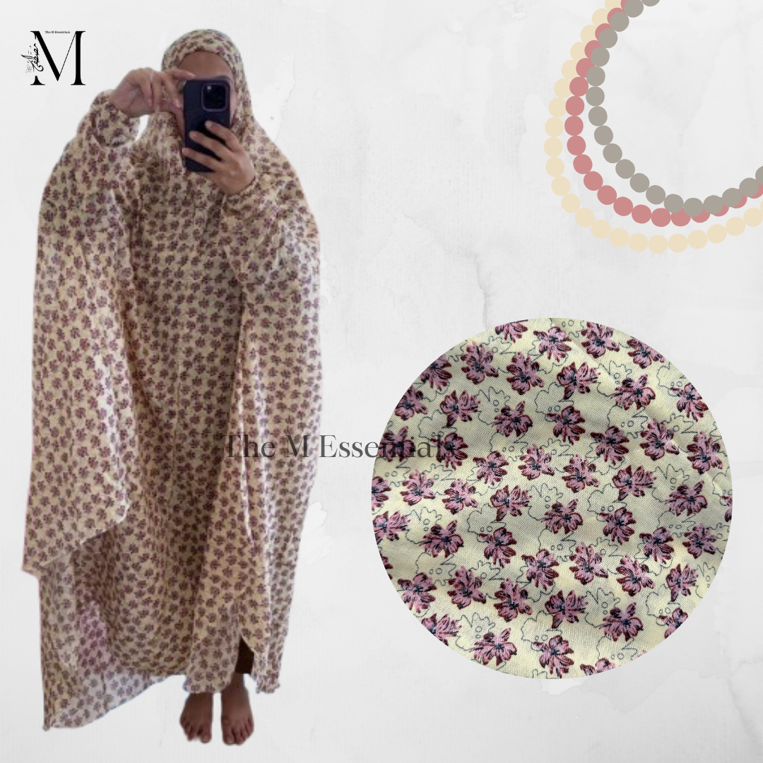 Makhani Hijab or Namaz Chaddar in printed fabric with elastic sleeves and elastic headband.